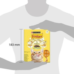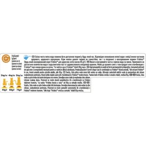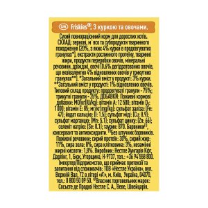 Friskies з куркою та овочами створений для того, щоб підтримувати здоров’я вашого котика на кожному етапі його активного дня. Завдяки унікальному поєднанню довгастих м’ясних гранул (що містять 4% курки) та трикутних овочевих гранул, корм забезпечує організм усіма життєво важливими нутрієнтами. Високий вміст протеїну (30%) допомагає підтримувати м'язову масу, а незамінні жирні кислоти дбають про те, щоб шкіра тварини була здоровою, а шерсть — густою та блискучою.