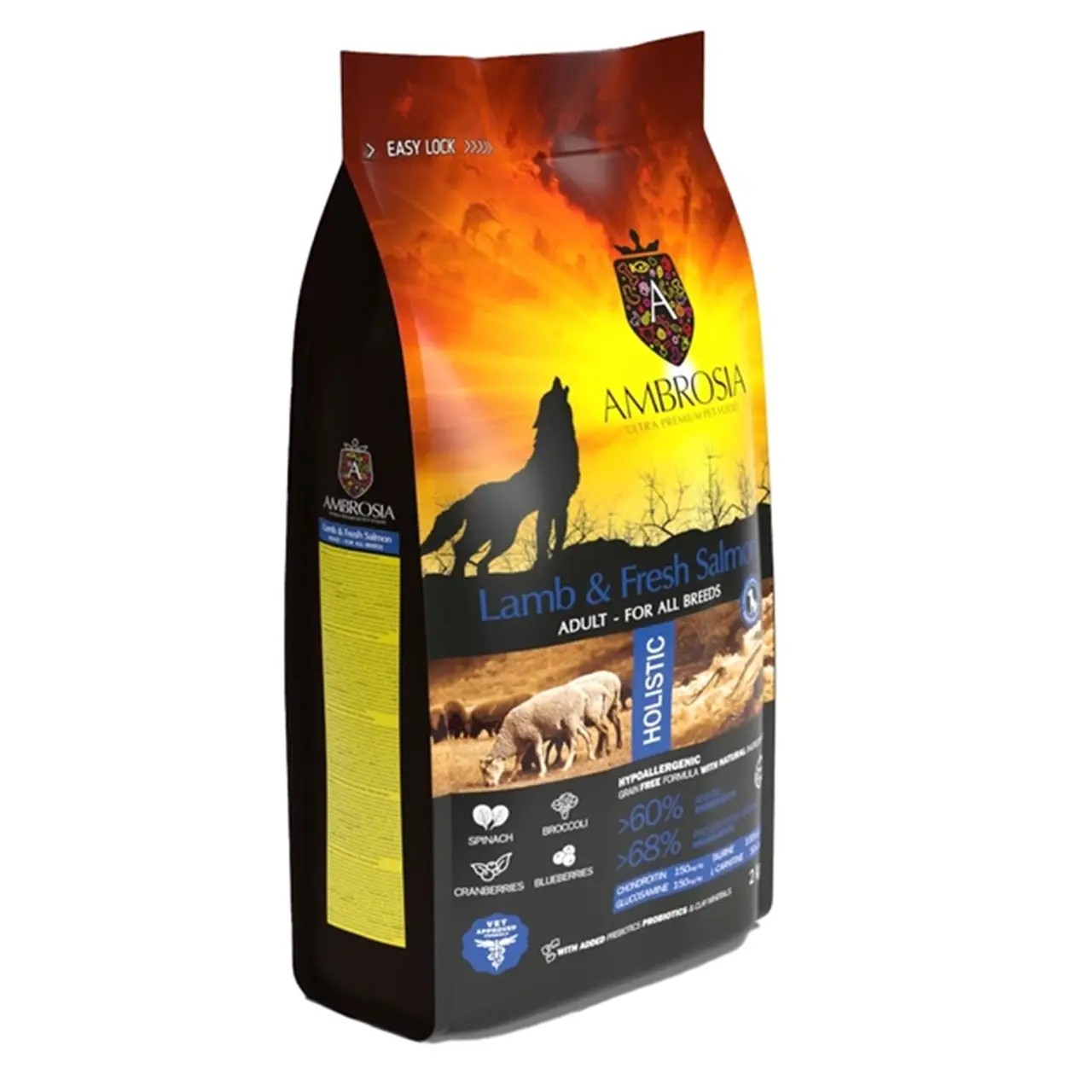 Ambrosia Grain Free Dog Adult Fresh Salmon & Lamb (2 кг) — це гіпоалергенний беззерновий корм класу ультрапреміум, розроблений для дорослих собак усіх порід. Унікальна формула поєднує легкозасвоюваний білок свіжого філе лосося (18%) та поживну зневоднену ягнятину, забезпечуючи улюбленця енергією, міцним імунітетом та здоровим травленням завдяки комплексу пребіотиків і пробіотиків.