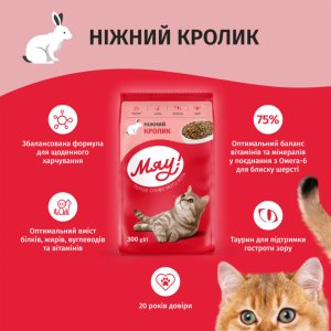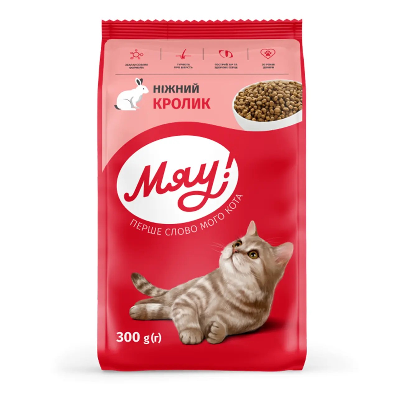 Сухий корм «Мяу!» з кроликом (300 г) — це повнораціонне збалансоване харчування для дорослих котів, яке поєднує в собі апетитний смак та необхідний комплекс поживних речовин. Завдяки вмісту дієтичного білка кролика та збалансованій формулі, корм забезпечує вихованця енергією для активного життя, підтримує здоров'я м'язів та сприяє відмінному зовнішньому вигляду.