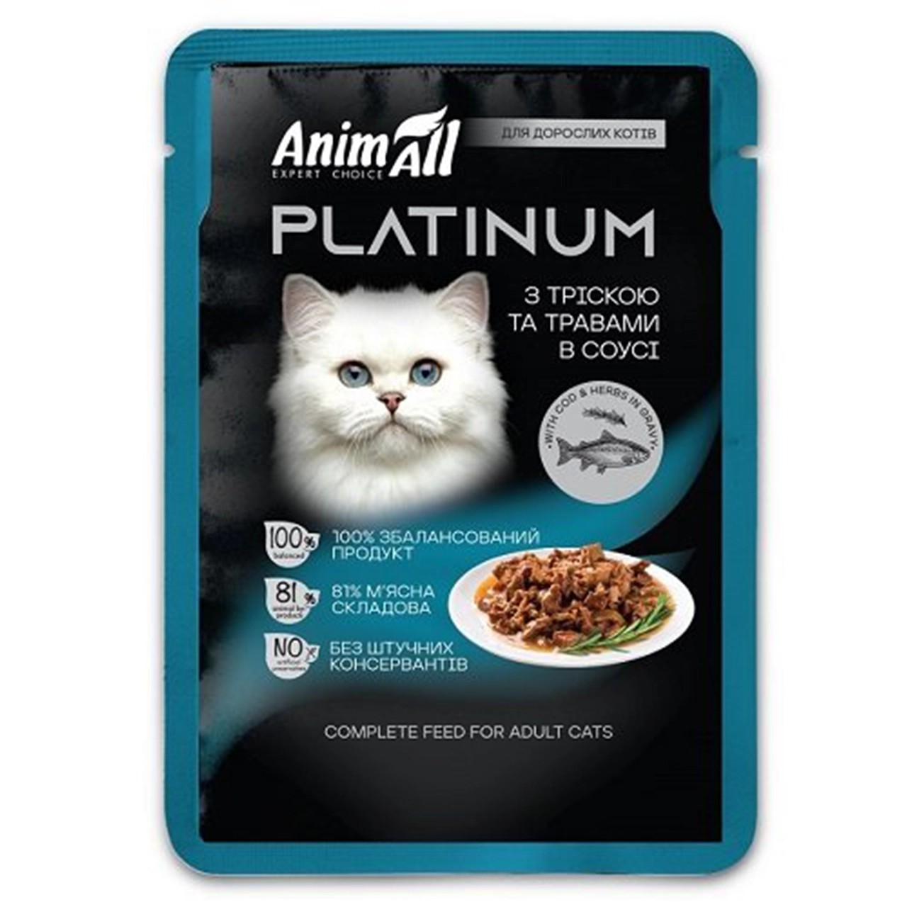 Вологий корм AnimAll Platinum для дорослих котів тріска з травами 85г