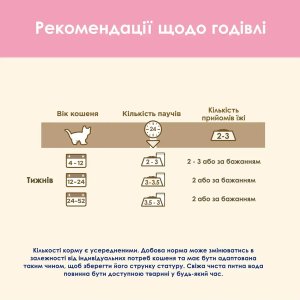 Ніжні шматочки в прозорому желе мають привабливу текстуру та аромат, що допомагає кошеняті швидше звикнути до самостійного живлення. Склад збагачений незамінною амінокислотою таурином та вітамінним комплексом, які мають критичне значення для підтримки гостроти зору та серцевої діяльності. Корм також підходить для годування вагітних і лактуючих кішок, забезпечуючи їх додатковою енергією та поживними речовинами. У складі відсутні штучні барвники та консерванти.