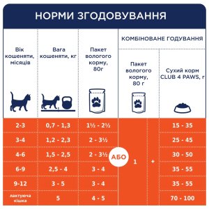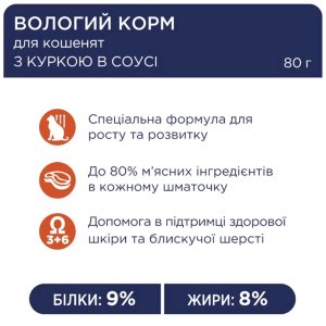 Club 4 Paws Premium з індичкою розроблений з урахуванням особливостей незміцнілого організму кошенят. Високий вміст м'ясних інгредієнтів (80% у кожному шматочку) гарантує надходження якісного тваринного білка, необхідного для формування міцної мускулатури. Особлива формула 9/8 (співвідношення білків та жирів) оптимально збалансована для покриття високих енергетичних потреб зростаючої тварини.