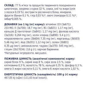 Склад: 80% м‘яса та продуктів тваринного походження в шматочках (зокрема з індички 9%), олії та жири (олія з лосося 0,27%), екстракти рослинного білка, злаки, мінерали, фрукти (банан, глід), цукри, овочі (помідори), імбир*. (*Натуральні інгредієнти).
