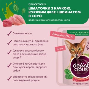 Вологий корм Delickcious шматочки з качкою, курячим філе і шпинатом в соусі 85 г