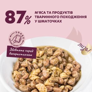 Приваблива текстура: Апетитні шматочки в ніжному соусі, які подобаються вибагливим тваринам.