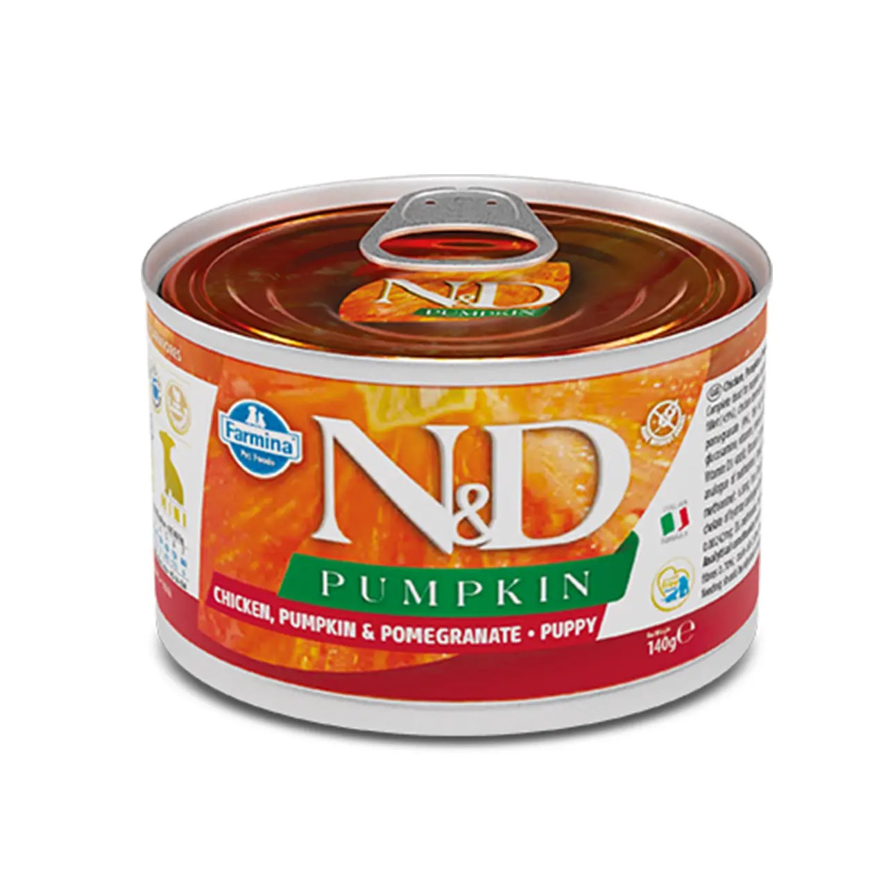 Вологий корм Farmina N&D Grain Free Pumpkin Puppy Mini (140 г) — це повнораціонний беззерновий раціон суперпреміум класу, створений спеціально для цуценят малих порід, а також вагітних і годуючих самок. Поєднання свіжої курки, поживного гарбуза та вітамінного граната забезпечує організм малюка необхідною енергією для здорового росту, міцного імунітету та правильного травлення.