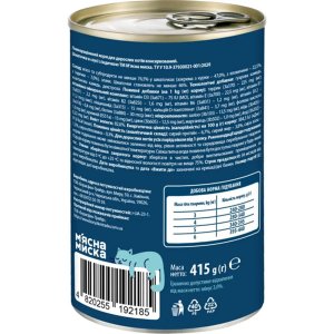 Раціон збагачений таурином (225 мг), який є незамінним для здоров'я серця та гостроти зору котів. Також склад включає широкий спектр вітамінів (D3, E, група B) та мікроелементів (цинк, залізо, йод, селен), що піклуються про імунітет та обмін речовин. Корм не має протипоказань для стерилізованих тварин і завдяки вологому формату допомагає підтримувати водний баланс організму. Велика упаковка 415 г є зручним та економічним рішенням для щоденного використання.